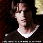 Dean: “Yeah, you know what? There’s a ton of lore on unicorns too. In fact, I hear that they, they ride on silver moonbeams, and they shoot rainbows out of their ass.”