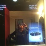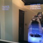 Men’s washroom and women’s washroom, each with an ad in the mirror. Both ads are for the same car. However, the text is slightly changed – in the men’s, it tells you that you look a million bucks but would look even better in that car. In the women’s, it gives you concern that you’re having a bad hair day but that’d be okay if you had that car.