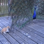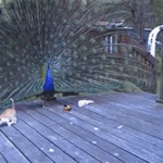 The peacock is trying so hard to pose for the camera but the kittie is just fuckin’ up his swagger.