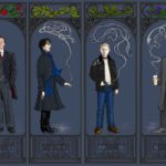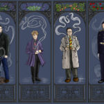 Mycroft is shown with roses, partly because roses are a symbol of England, but mostly because I couldn’t resist the visual pun of having Mycroft standing literally under the roses when everything he does is sub rosa. Sherlock is shown with laurel, which symbolizes victory but also pride; John is shown with English oak , which symbolizes strength and courage; Lestrade with irises, which are associated with faith, valor, friendship and wisdom.