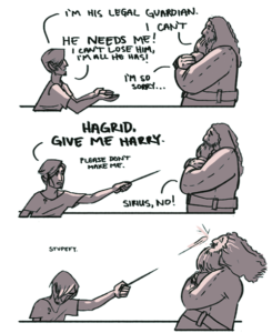 I’m his legal guardian. I can’t. He needs me! I can’t lose him, I’m all he has. I’m so sorry… Hagrid, give me Harry. Please don’t make me. Sirius, no! Stupefy.