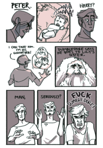 Peter. Wah! Harry? I can take him. I’m his godfather! Dumbledore says he goes to Lily’s sister. Man, seriously? FUCK Dumbledore!