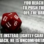 Older warriors who get a shiver around magic-users not because of the whole ‘fireball’ thing but the ‘I don’t know what a normal pain tolerance is anymore’ effect of too much healing. Permanent paralysis and loss of sensation in limbs is pretty much a given in the later years of any fighter’s life. Did I have a stroke or did the mage just heal too hard and now this side of my face doesn’t work? No i’m not dead from the dragon’s claws but I can’t even bend my torso anymore because of how the scar tissue grew out of me like a vine.