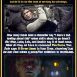 So did his parents make the same mistake so many others do when their children go astray? Instead of looking for a flaw in the child’s nurturing, looking at it as a flaw in the child’s nature? We know from the novelization that Leia was aware of Snoke’s influence but didn’t tell Han. If Han had known, would he have looked at his son differently, or would it have made the situation seem even more hopeless?